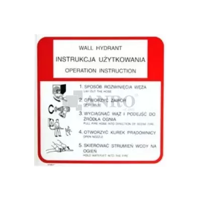 Instrukcja obsługi hydrantu wewnętrznego ABC (10x10cm) 100x100mm P (IP17A) to tabliczka informacyjna umieszczana przy hydrantach wewnętrznych, zawierająca skróconą instrukcję obsługi. Jej celem jest szybkie i skuteczne przypomnienie użytkownikom, jak uruchomić hydrant w przypadku pożaru. Dzięki czytelnej i zwięzłej instrukcji, tabliczka zwiększa szansę na sprawne użycie hydrantu w sytuacji zagrożenia pożarowego.