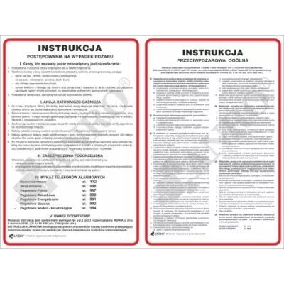 Instrukcja przeciwpożarowa ogólna i alarmowa 300x400mm P (IP01/02) to tablica informacyjna zawierająca kluczowe informacje na temat postępowania w przypadku pożaru oraz procedury alarmowe. Instrukcja ma na celu zapewnienie bezpieczeństwa osobom przebywającym w budynku poprzez edukację i instrukcje dotyczące właściwego zachowania w sytuacjach zagrożenia pożarowego.