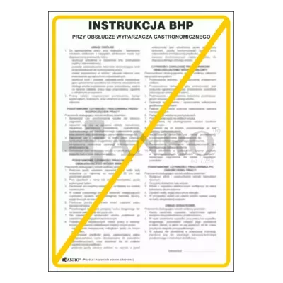 Instrukcja BHP przy obsłudze wyparzacza gastronomicznego 250x350 mm P (IBG10/P). Instrukcja powinna być umieszczona w pobliżu wyparzacza gastronomicznego, w widocznym miejscu, tak aby każdy pracownik miał do niej łatwy dostęp. Instrukcja ma na celu przypominanie o zasadach bezpiecznej obsługi wyparzacza, zwiększenie świadomości o potencjalnych zagrożeniach i zachęcenie do zachowania szczególnej ostrożności. Jest ważnym elementem wyposażenia każdej kuchni gastronomicznej, w której używany jest wyparzacz.