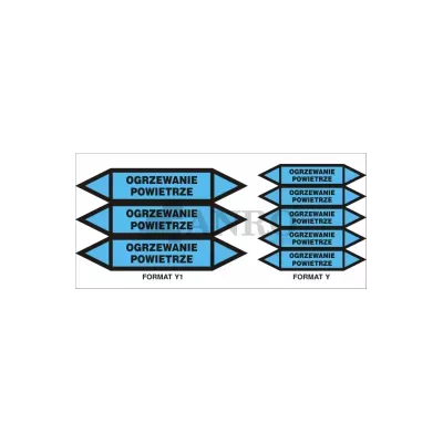 Oznakowanie rurociągu OGRZEWANIE POWIETRZE 40x120 mm, arkusz 3 szt. (3K04/Y1/F). Naklejki stosuje się do oznaczania rurociągów w systemach ogrzewania powietrznego w budynkach przemysłowych, komercyjnych i mieszkalnych. Należy je umieszczać w widocznych miejscach na rurociągach, w regularnych odstępach, w pobliżu zaworów, przyłączeń i innych istotnych elementów instalacji.