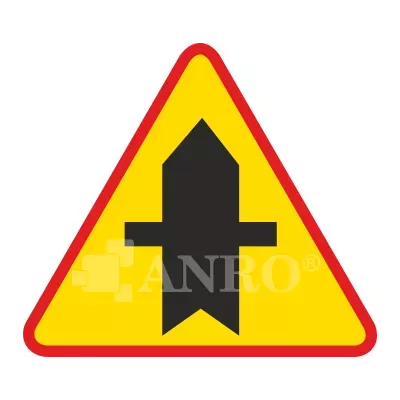 Znak drogowy A-6a ma kształt trójkąta równobocznego z czerwonym obramowaniem i żółtym tłem, na którym umieszczony jest czarny symbol skrzyżowania z drogami podporządkowanymi po obu stronach.