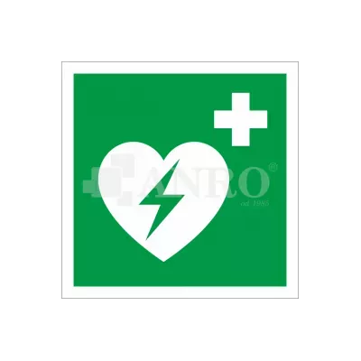 Znak Automatyczny defibrylator 200x200mm PLS (E010). Znak stosuje się w miejscach publicznych, biurach, szkołach, galeriach handlowych i innych przestrzeniach, gdzie znajduje się automatyczny defibrylator zewnętrzny (AED). Znak powinien być umieszczony w widocznym miejscu, np. na ścianie, drzwiach lub w pobliżu miejsca, gdzie znajduje się AED. Znaki tego typu mają na celu szybkie wskazanie lokalizacji urządzenia.