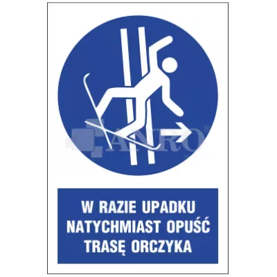Znak BHP W razie upadku opuść trasę orczyka 200x300mm P (M035/1). Znak stosuje się w pobliżu wyciągów orczykowych, gdzie istnieje ryzyko upadku podczas korzystania z urządzenia. Znak powinien być umieszczony w widocznym miejscu, np. przy wejściu na trasę, wzdłuż trasy, gdzie najczęściej dochodzi do upadków. Znaki tego typu mają na celu przypominanie o zasadach bezpieczeństwa i sposobie postępowania w razie upadku. Znak ma na celu zwiększenie świadomości o zagrożeniach i zachęcenie do zachowania ostrożności . Jest ważnym elementem oznakowania stoku narciarskiego, który pełni kluczową rolę w zapewnieniu bezpieczeństwa. Jego wyraźna widoczność i czytelny przekaz informują o potencjalnych zagrożeniach i pomagają w zapobieganiu wypadkom.