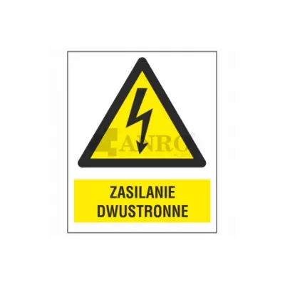 Znak elektryczny Zasilanie dwustronne 210x297mm F (7EOA) to tablica informacyjna ostrzegająca o obecności zasilania dwustronnego w urządzeniach elektrycznych. Znak ma na celu zapobieganie porażeniom prądem i innym wypadkom związanym z pracami elektrycznymi. Dzięki wyraźnym i czytelnym oznaczeniom znak zapewnia bezpieczeństwo elektrykom i innym osobom pracującym w pobliżu urządzeń pod napięciem.
