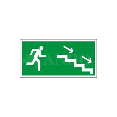 Znak ewakuacyjny Kierunek do wyjścia schodami w dół 200x400mm PS (8E). Znak stosuje się w budynkach użyteczności publicznej, biurach, halach produkcyjnych i innych miejscach, gdzie przebywają ludzie. Znak powinien być umieszczony w widocznym miejscu, np. nad drzwiami, na korytarzach, w pobliżu schodów. Znaki tego typu mają na celu ułatwienie ewakuacji w sytuacjach zagrożenia.