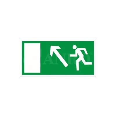 Znak ewakuacyjny Kierunek do wyjścia w górę w lewo 150x300mm PT (49E). Znak stosuje się w budynkach użyteczności publicznej, biurach, szkołach, szpitalach oraz w zakładach pracy, w miejscach, gdzie istnieje potrzeba wskazania drogi ewakuacyjnej. Znak powinien być umieszczony w widocznym miejscu, np. nad drzwiami, na ścianach korytarzy, w pobliżu schodów, w sposób umożliwiający łatwe odnalezienie drogi ewakuacyjnej. Znaki tego typu mają na celu przypominanie o kierunku ewakuacji. Znak ma na celu zwiększenie świadomości o kierunku ewakuacji i zachęcenie do szybkiego opuszczenia budynku w sytuacji zagrożenia. Jest ważnym elementem systemu bezpieczeństwa pożarowego, który pełni kluczową rolę w zapewnieniu bezpieczeństwa osób przebywających w budynku. Jego wyraźna widoczność i czytelny przekaz informują o potencjalnych drogach ucieczki i pomagają w zapobieganiu wypadkom.